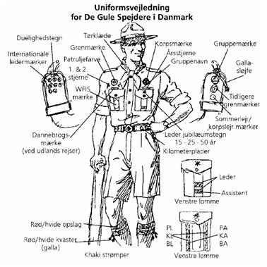 Uniformen er et praktisk stykke tøj. Den består af en kaki skjorte, med gruppens tørklæde, som alle er forskellige. Ledere der har taget Woodbeadskursus har ret til at bære Gilwelltørklæde og Woodbeads. Om sommeren går vi i korte bukser og det gælder både spejderen og lederen. Hertil hører lange kaki strømper med rød/hvide opslag. Når vejret bliver koldere, trækker vi i lange bukser, der holdes i grønne, kaki, mørke nuancer. Militærbukser er meget ilde set. Til uniformen hører De Gule Spejderes bælte som en selvfølge.